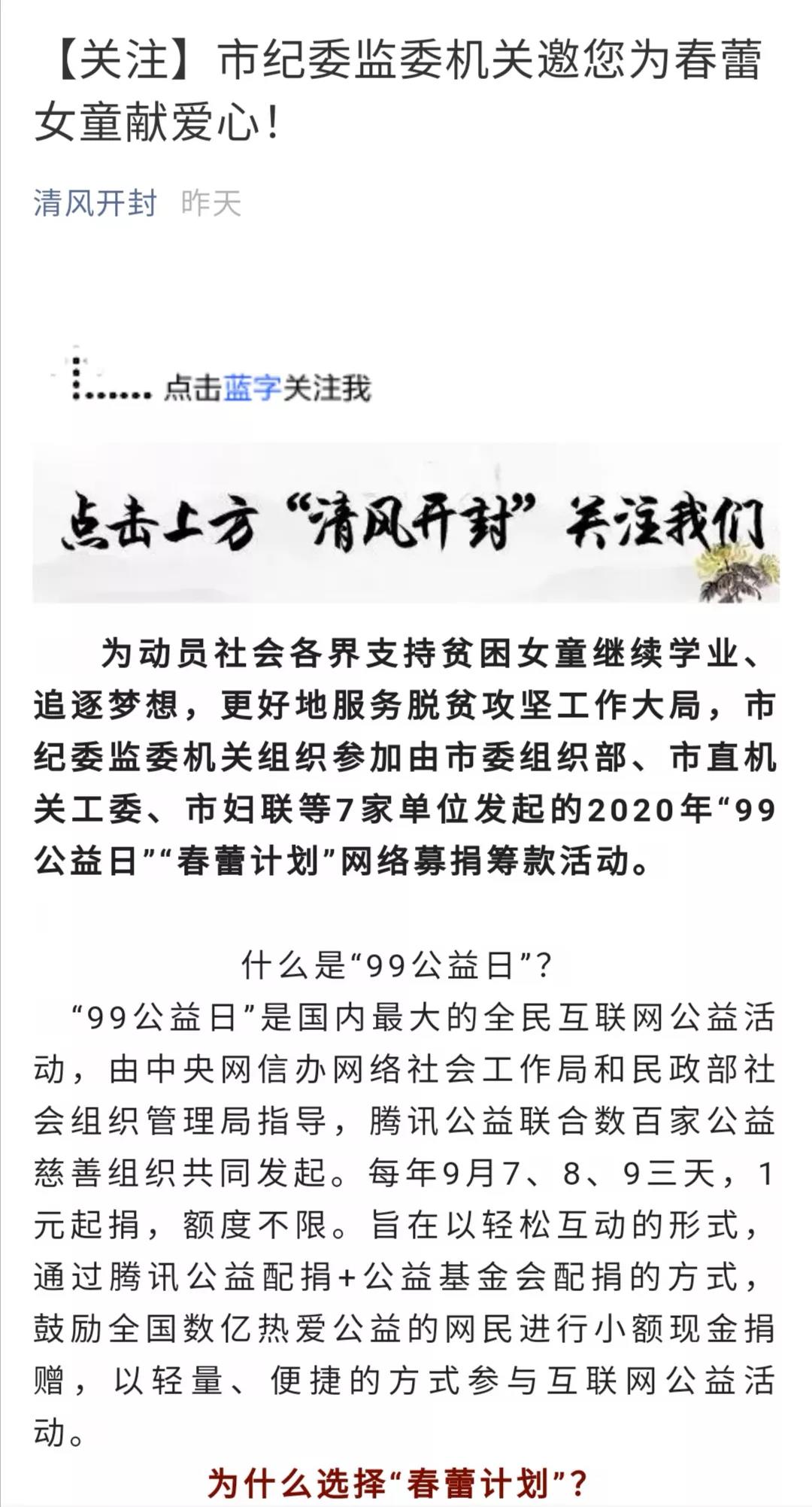 “我们在微信公众号‘清风开封’设置了捐款小程序,同志们,动动手指,就能为一个女孩点亮圆梦学堂的希望,欢迎大家踊跃参与‘99公益日’活动……”