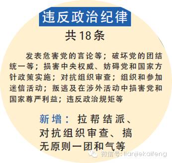 《条例》第61条—62条明确了“党员领导干部对违反政治纪律和政治规矩等错误思想和行为放任不管,搞无原则一团和气,造成不良影响”,“违反党的优良传统和工作惯例等党的规矩,在政治上造成不良影响”等违反政治纪律和政治规矩的行为,并对处分情形作了明确规定。