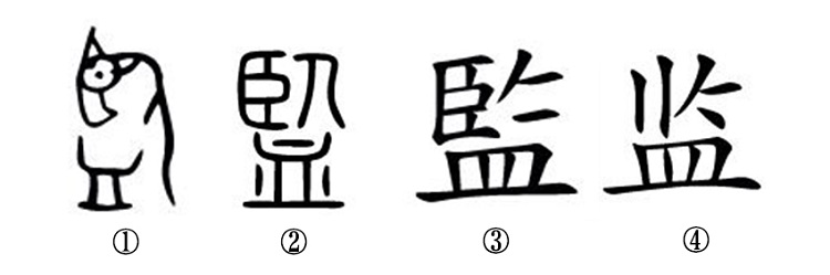 接着来看监字的字形演变。①是金文的形体,人的大眼睛已经移到了“皿”上,这就看得更清楚了。②是小篆形体,在器皿上加一小横,表示有水,“人”跳到“皿”上,“目”已经伪变成“臣”字,这就符合方块形体的要求了。③是楷书的写法,完全是由小篆演变而来。④是楷书简化字。