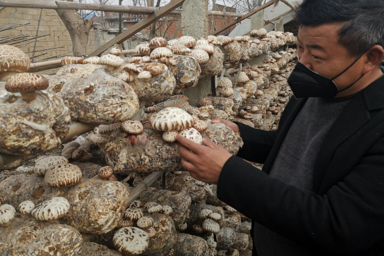 度过寒冷冬天,去除大棚遮掩,呼吸新鲜空气,香菇露出花颜,干群笑容满面,迎接明媚春天。